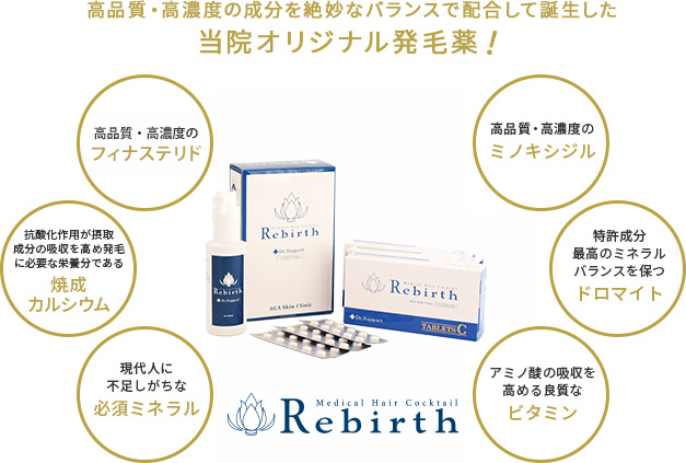 東京美容外科では髪の成長に必要な様々な医薬品をブレンドしたオリジナル発毛薬(内服薬・外用薬)を処方しております。体の内側・外側から髪の健康を整えることによって、驚くべき発毛効果を生み出すことが可能となりました。タブレット(内服薬)で体の内側から発毛しやすい環境に体を整え、さらにリキッド(外用薬)で直接毛根に発毛促進を働きかけることが可能です。この体の内側・外側から同時に薄毛改善を行える画期的な男性用オリジナル発毛薬が「Rebirth」(リバース)なのです。