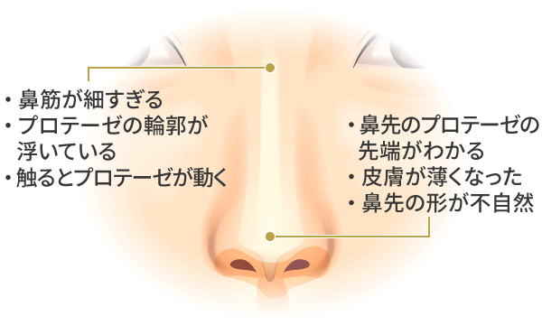 失敗の原因は様々ですが、プロテーゼの挿入位置や、形・大きさなどが合っていない場合がほとんどです。鼻はとても複雑な構造をしていて、手術後の変更は簡単ではなく、医師の技術とスキルが必要とされます。