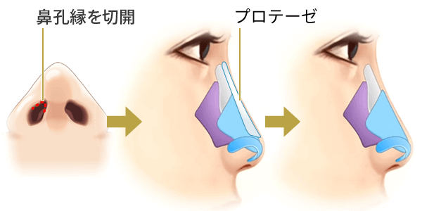 | 特徴 | 自身の身体から採取した耳介軟骨(耳の軟骨)や肋軟骨(肋骨と胸骨を結び付けている軟骨)、鼻中隔軟骨(鼻の奥にある軟骨)、筋膜などを使用するため、細菌感染や、組織同士皮膚が固定・癒着するため、破けて露出するなどのリスクを低減できます。 | プロテーゼと呼ばれる人工軟骨を鼻筋に沿って挿入します。プロテーゼは体内に入れても腐敗したりしないので、安心です。 |